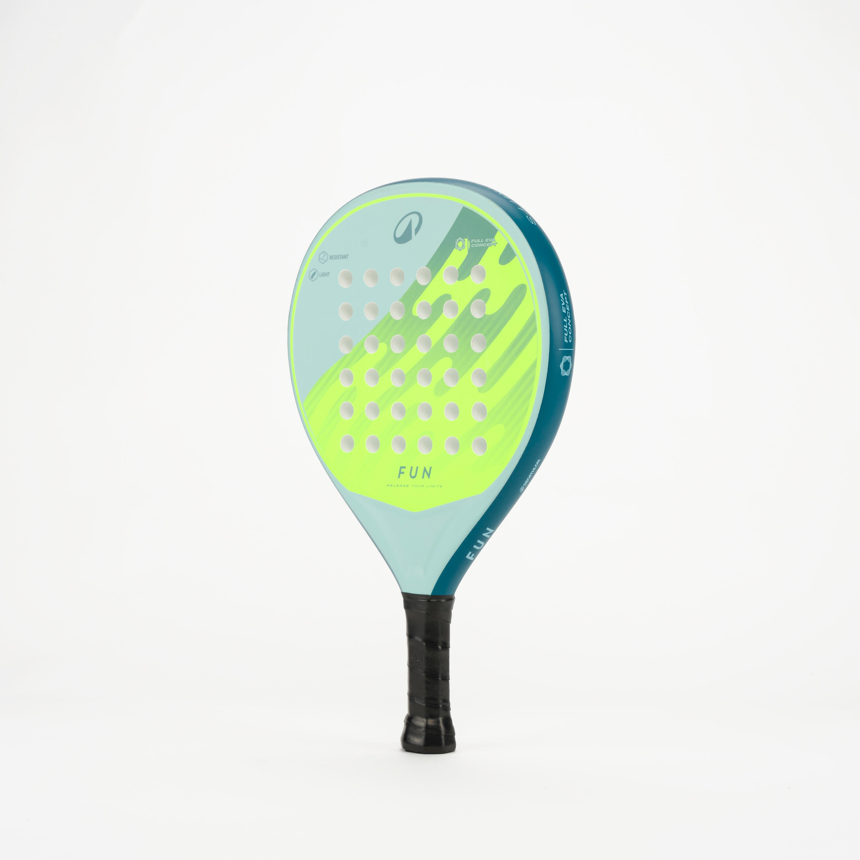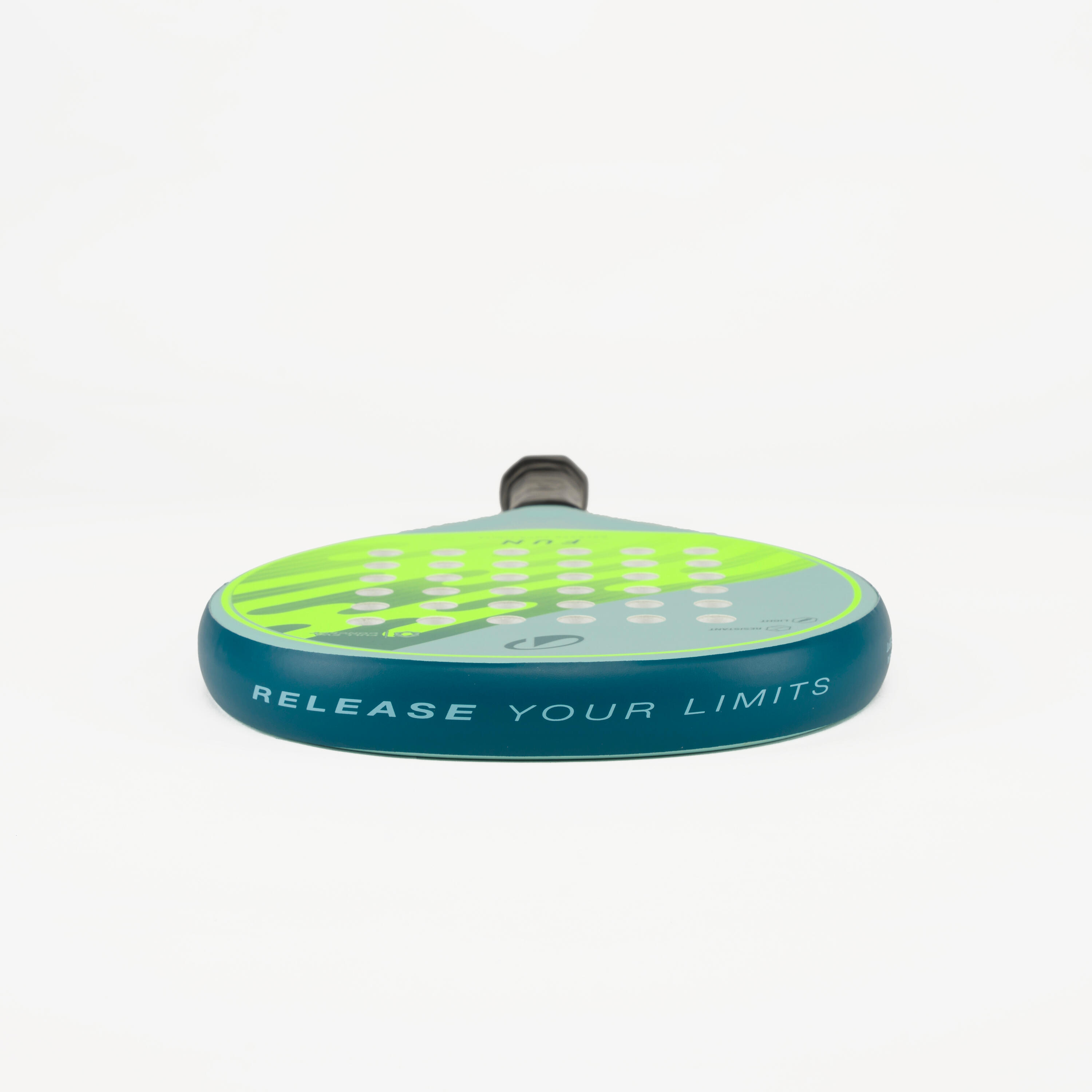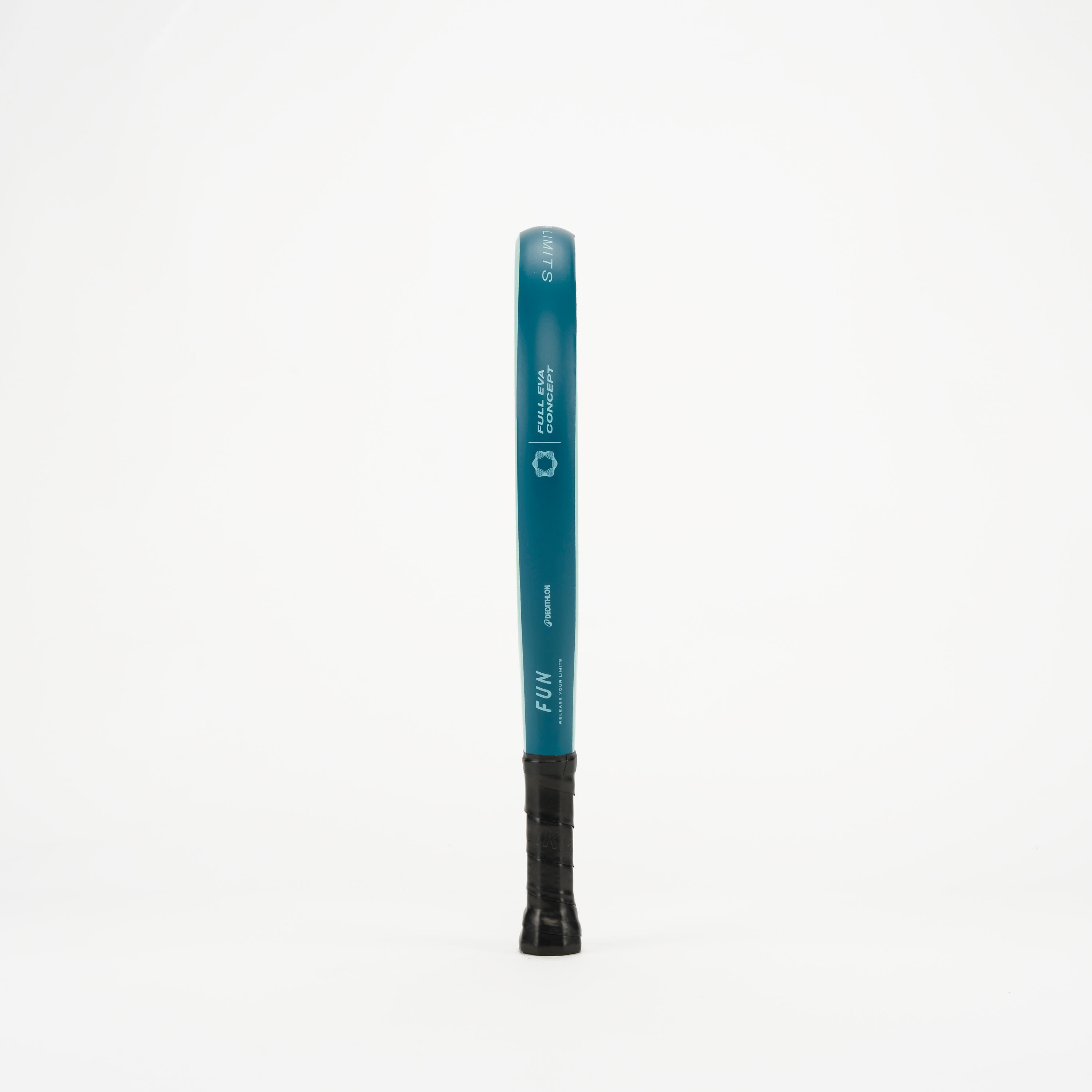 Forme ronde et équilibre vers le manche (contrôle). Surface en fibre de verre et noyau interne de Full Eva Concept (sweet spot élargi pour une grande tolérance). Poids léger, environ 265 g (confort)