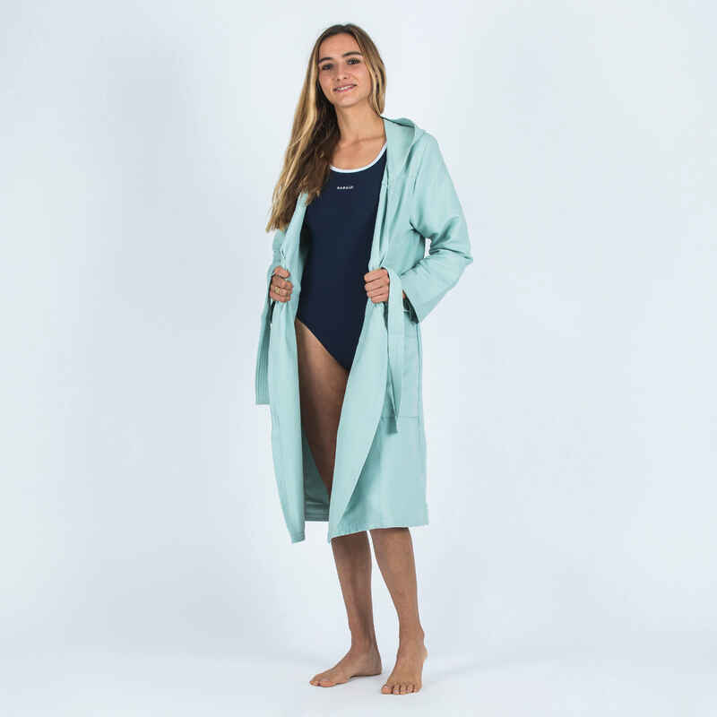 Doté d'une capuche, ceinture et poches, ce peignoir de bain en microfibre est idéal pour se sécher après la natation, le water polo ou l'aquagym. Ultra léger, il sèche vite et se stocke facilement.