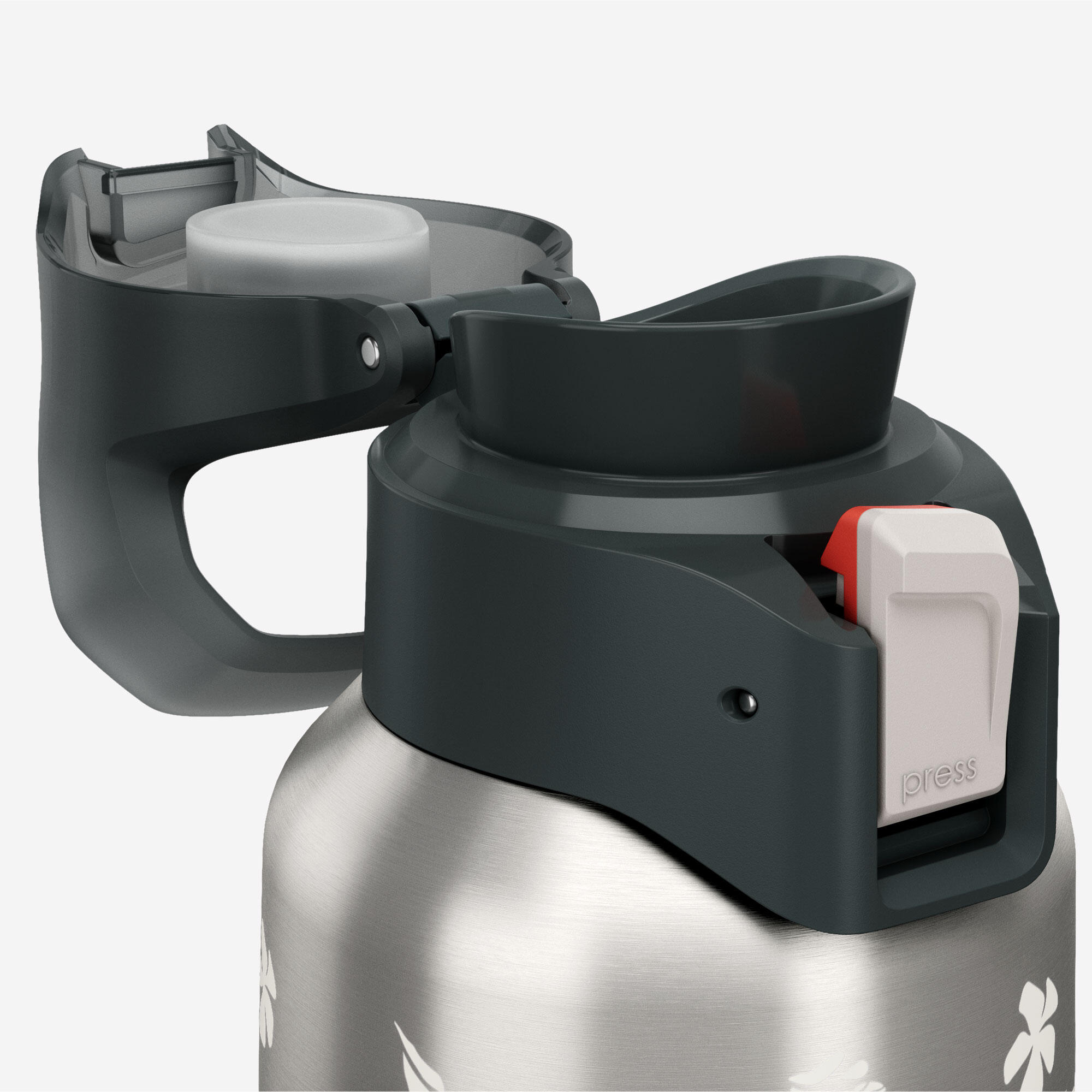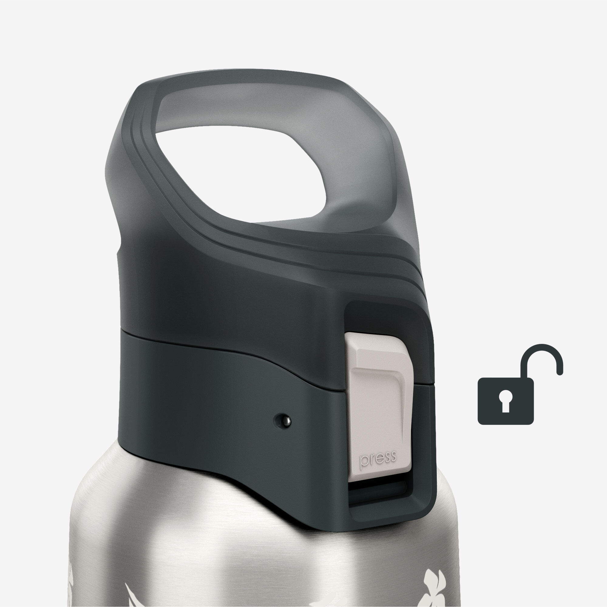 Le bouchon s'ouvre facilement à une main en appuyant sur le bouton blanc à l'endroit marqué "PRESS". Lors du transport il est possible de verrouiller ce bouton en glissant le bouton blanc vers le bas. Un espace rouge apparaît alors indiquant que le bouchon est verrouillé et il n'est plus possible d'appuyer.