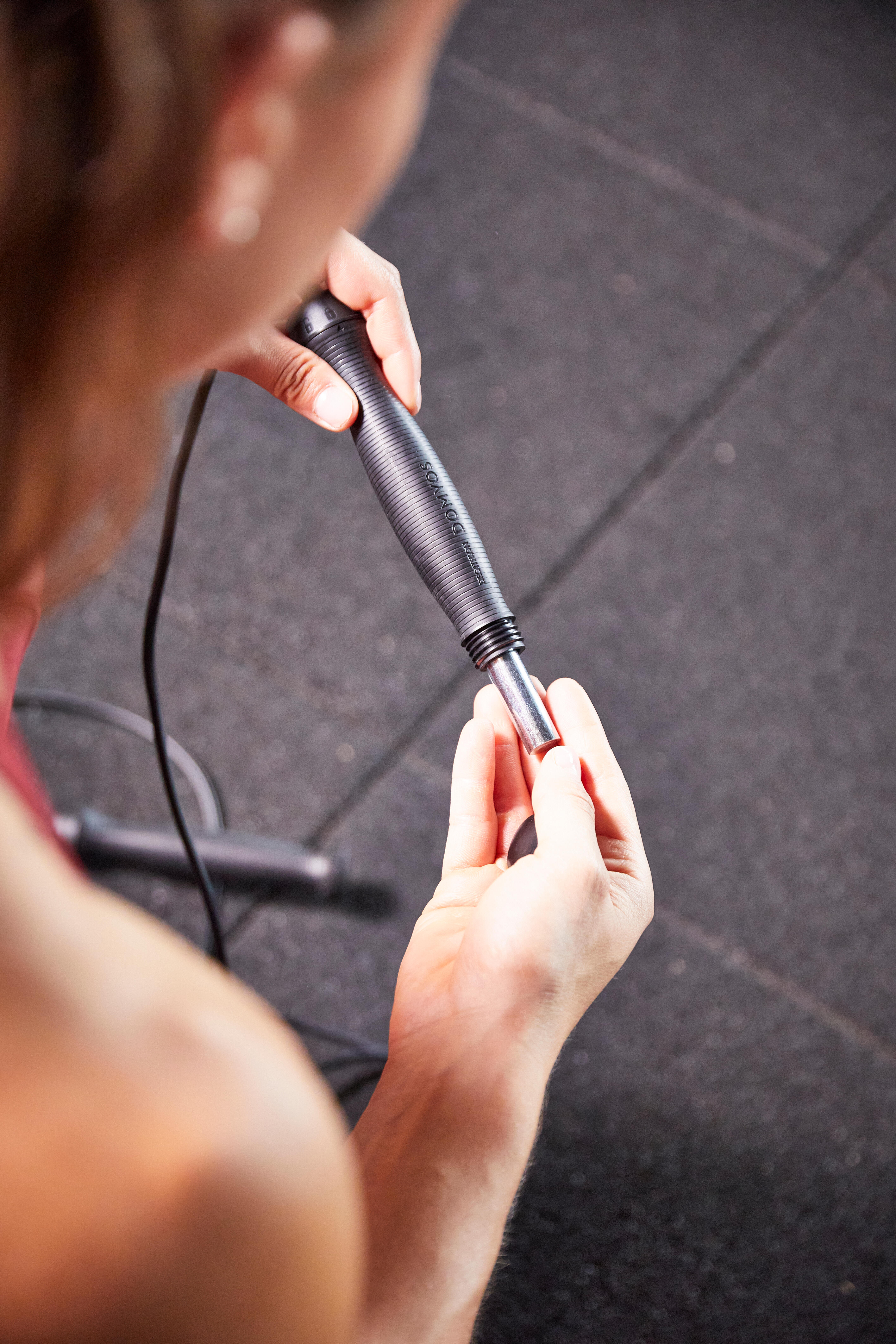La corde à sauter 700 lestée (2 x 90gr) a été conçue pour permettre une bonne préhension grâce à son ergonomie et son revêtement anti glisse.