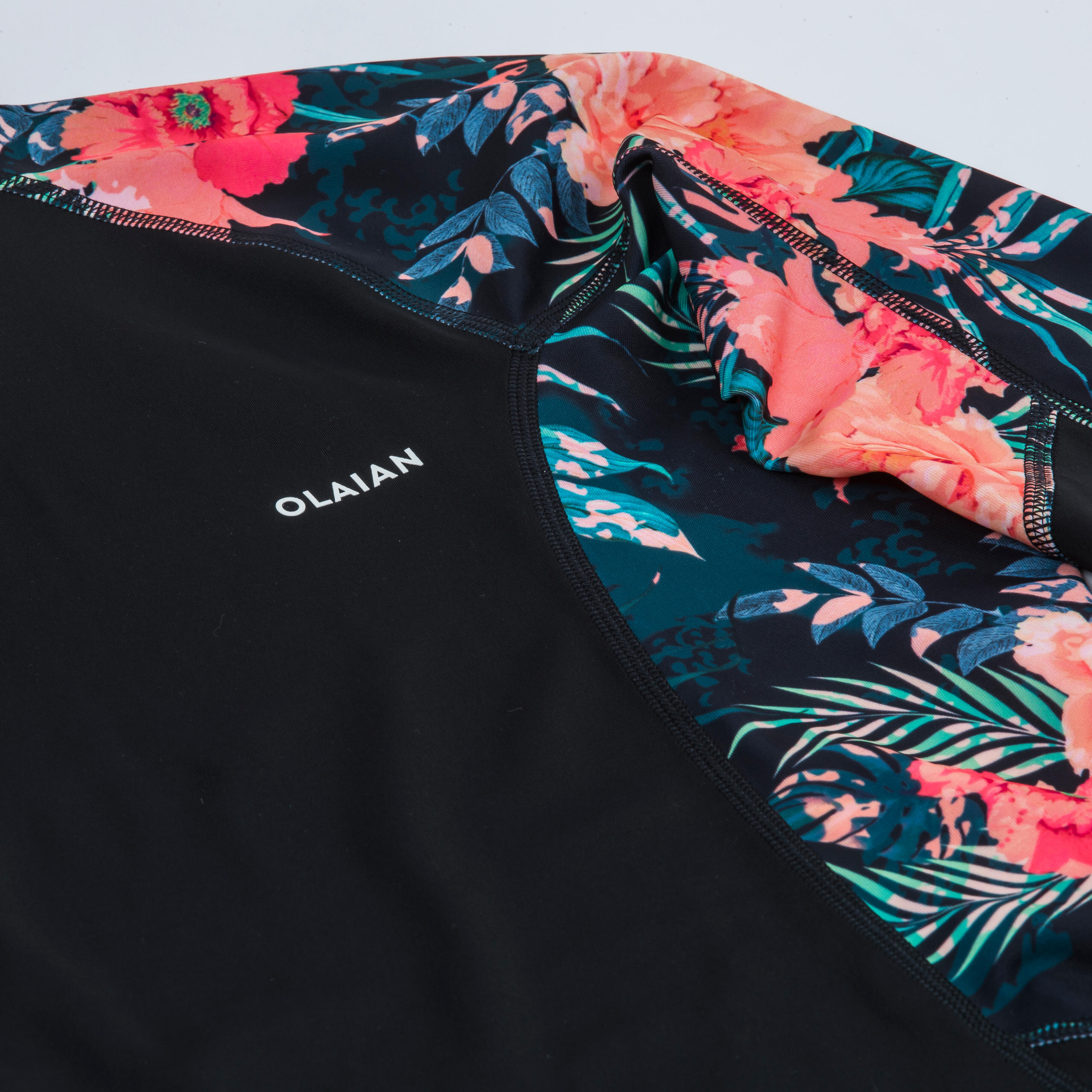 Ce top anti-UV OLAIAN dispose d'un cordon de serrage au niveau des hanches. Il permet de serrer le top pour assurer une meilleure stabilité. Il a également été étudié pour pouvoir passer le cordon du short de bain afin d'éviter que le top remonte pendant la pratique.