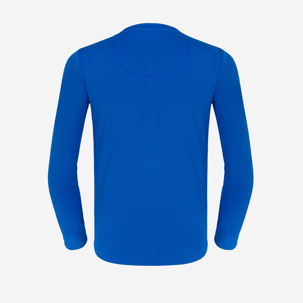 T-shirt anti-UV enfant manches longues pour protéger du soleil, même dans l'eau, et limiter les irritations au contact de la planche. Coupe ample pour un enfilage facile.