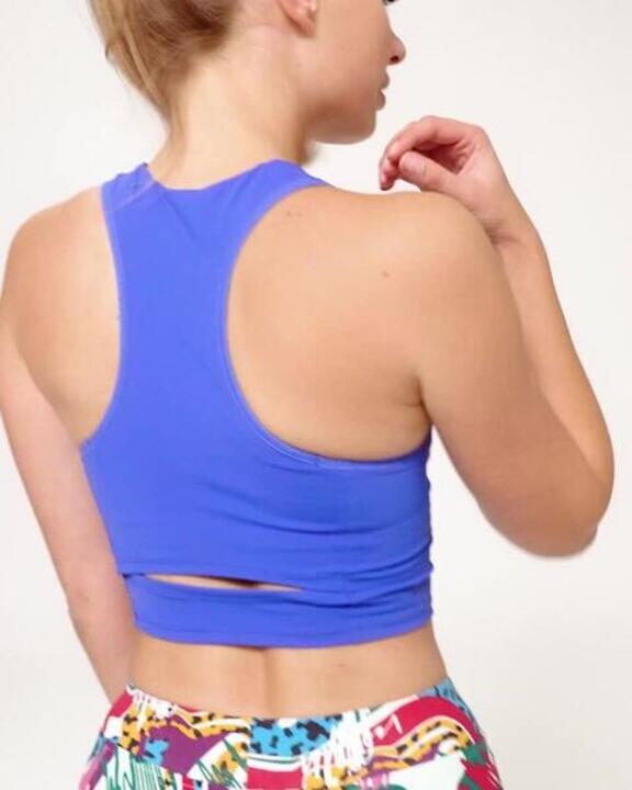 L'originalité de cette brassière est de coupler les avantages en termes de maintien d'une brassière et la coupe crop. Sur la brassière en première couche vient se poser un tissu en seconde couche pour créer un look crop top. Associée à un legging, elle permet de créer un look tendance et sportif.