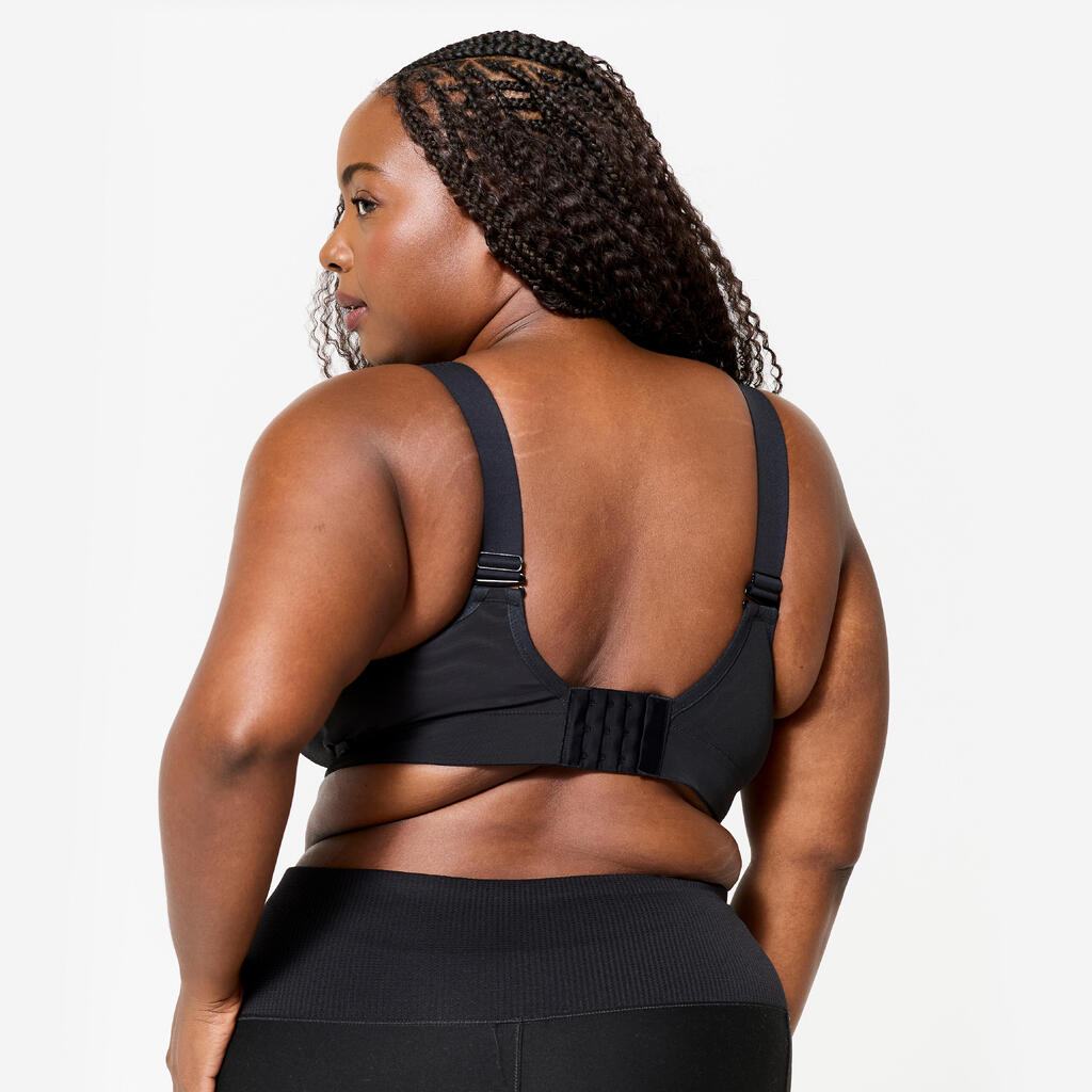 Tout a été pensé dans ce soutien-gorge de sport pour vous apporter le maximum de confort. Ses bonnets englobants renforcés soutiennent parfaitement la poitrine. Ses bretelles rembourrées et sa large bande élastique sous la poitrine améliore le confort de portage. Enfin les 3 positions d'agrafes dans le dos permettent d'ajuster la largeur du buste. Tous ces détails font de ce soutien-gorge un modèle particulièrement adapté aux poitrines généreuses jusqu'au bonnet H.
