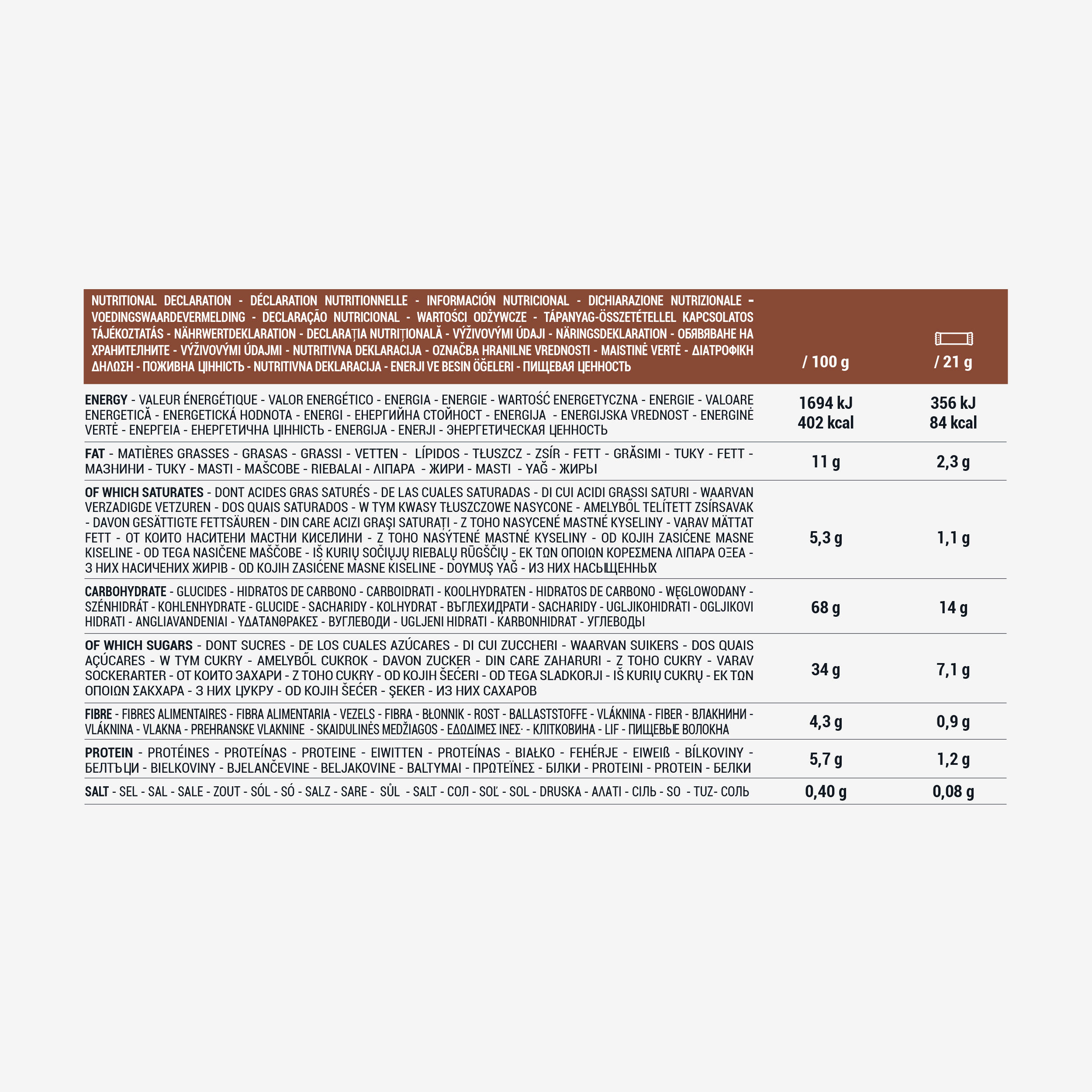 Valeurs nutritionnelles : 100g | 21g (=1 barre)