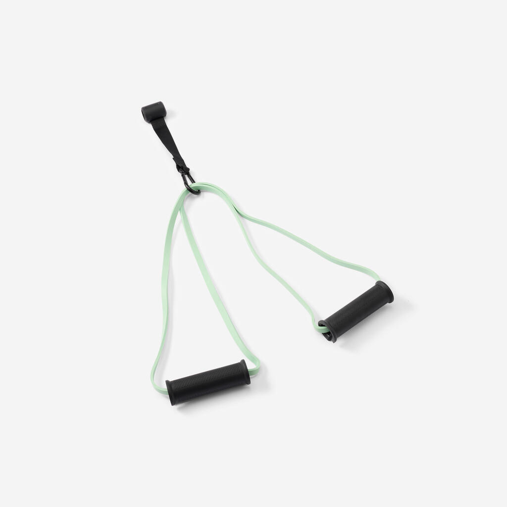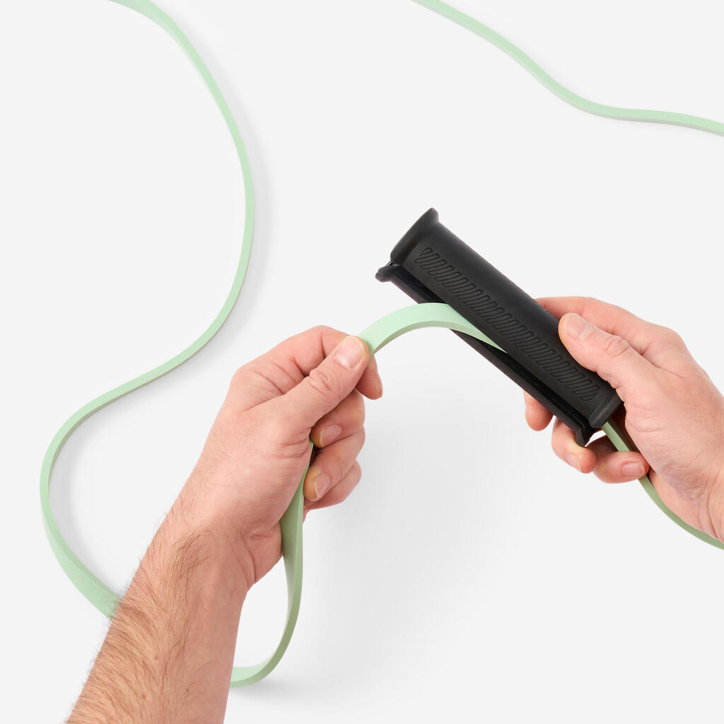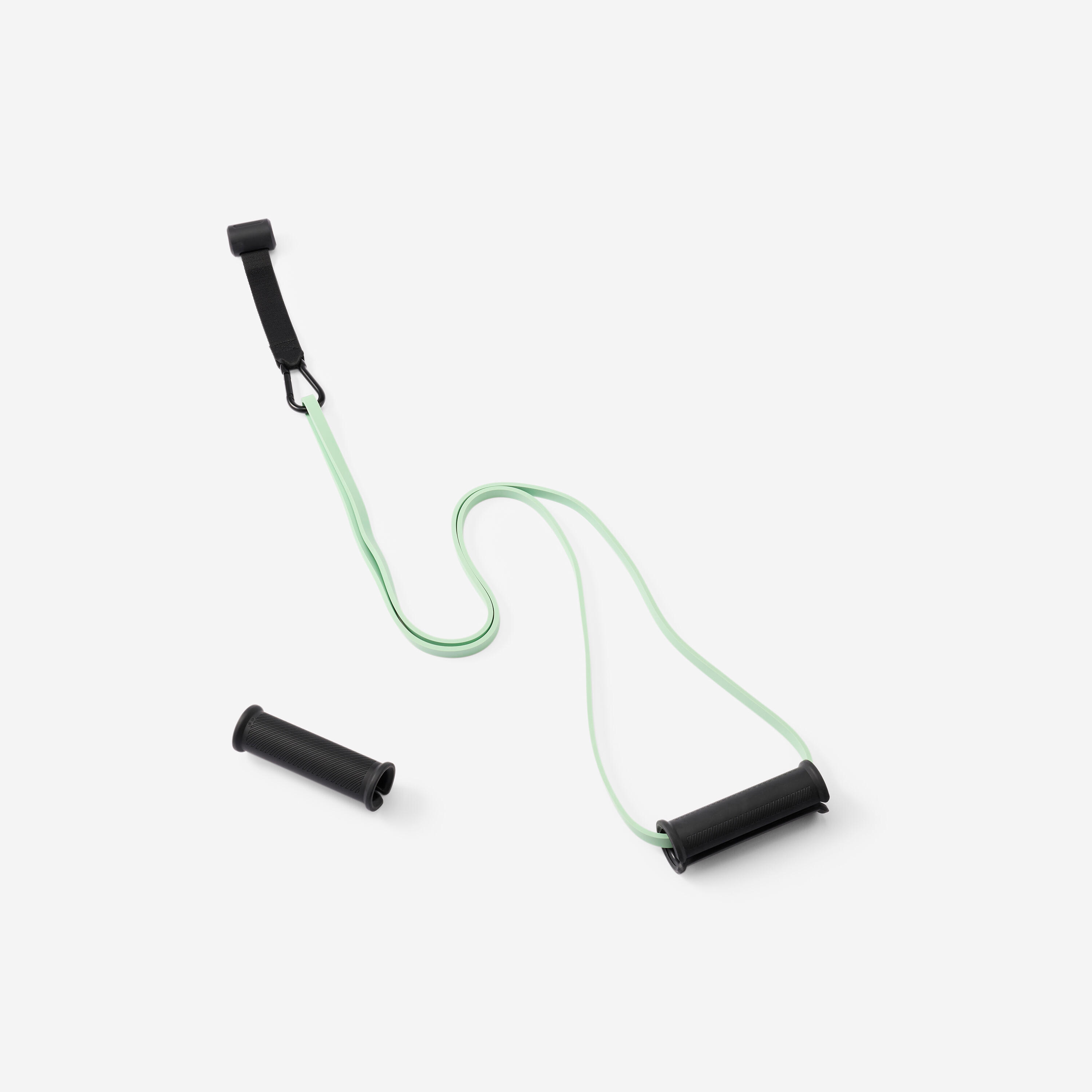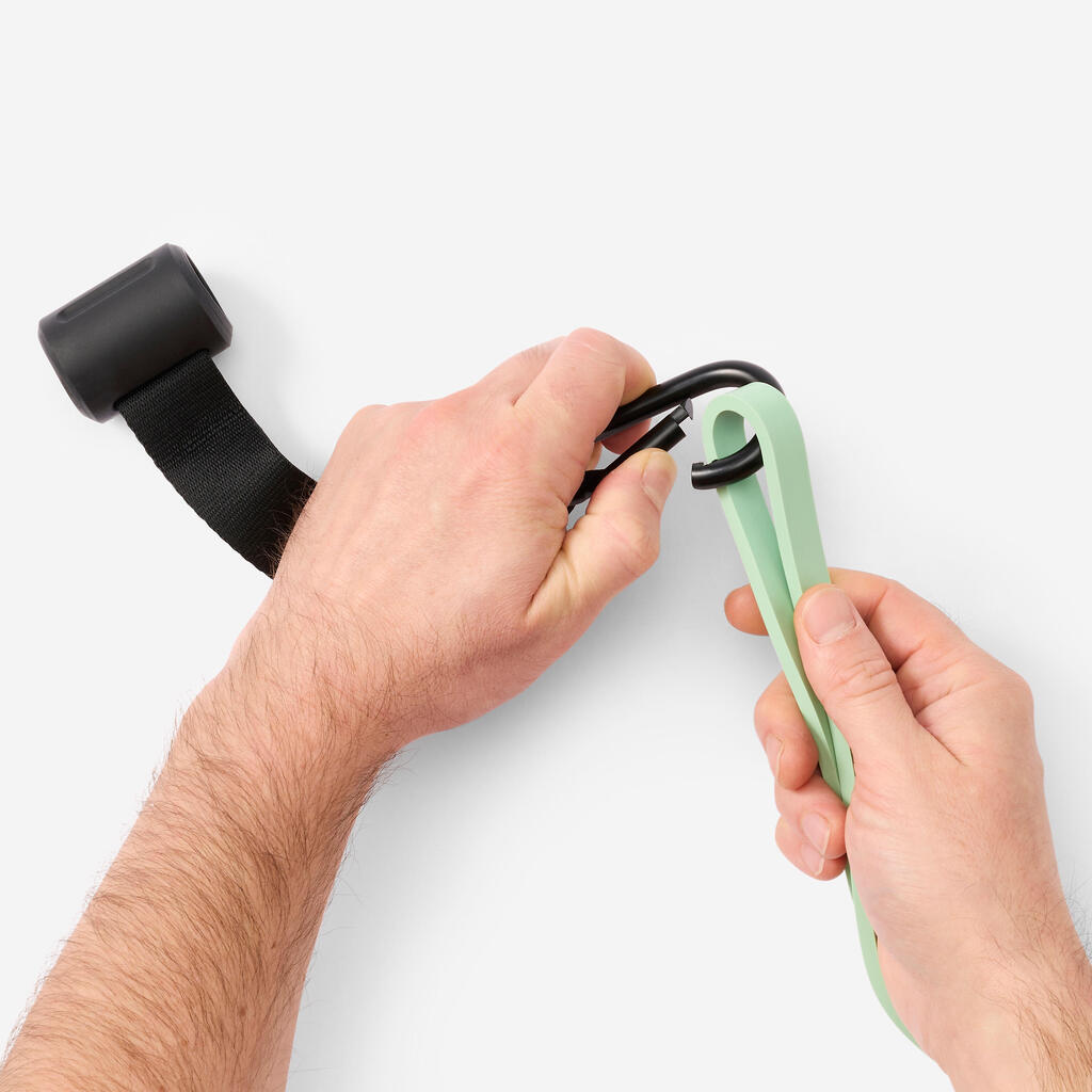 À l'intérieur de ce kit, un élastique 10kg, des poignées confort et un ancrage de porte, le tout transportable dans le sac de rangement fourni. De quoi vous entraînez où et quand vous voulez.