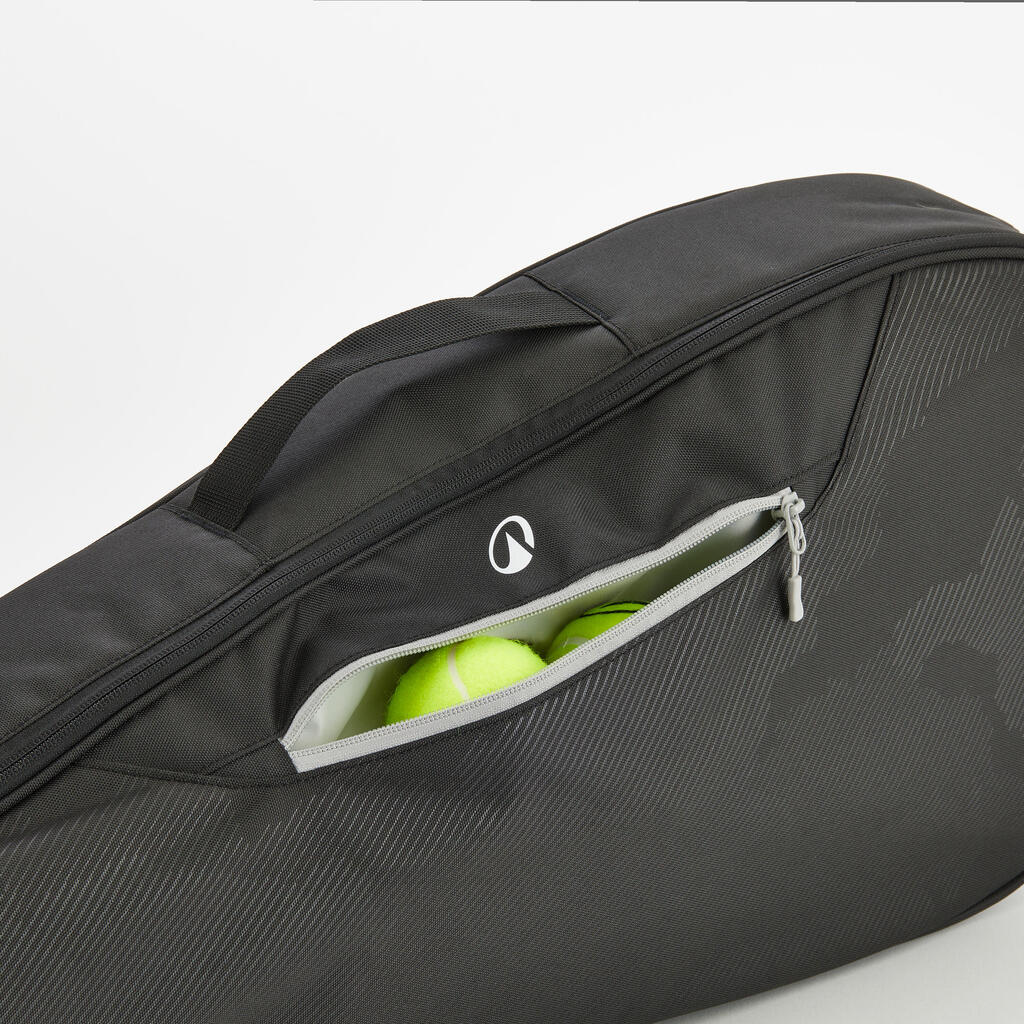 Ce sac sports de raquettes peut contenir jusqu'à 3 raquettes de tennis (adultes ou juniors). Il possède une poche zippée en mesh à l'intérieur, une lanière de transport, et une poignée.