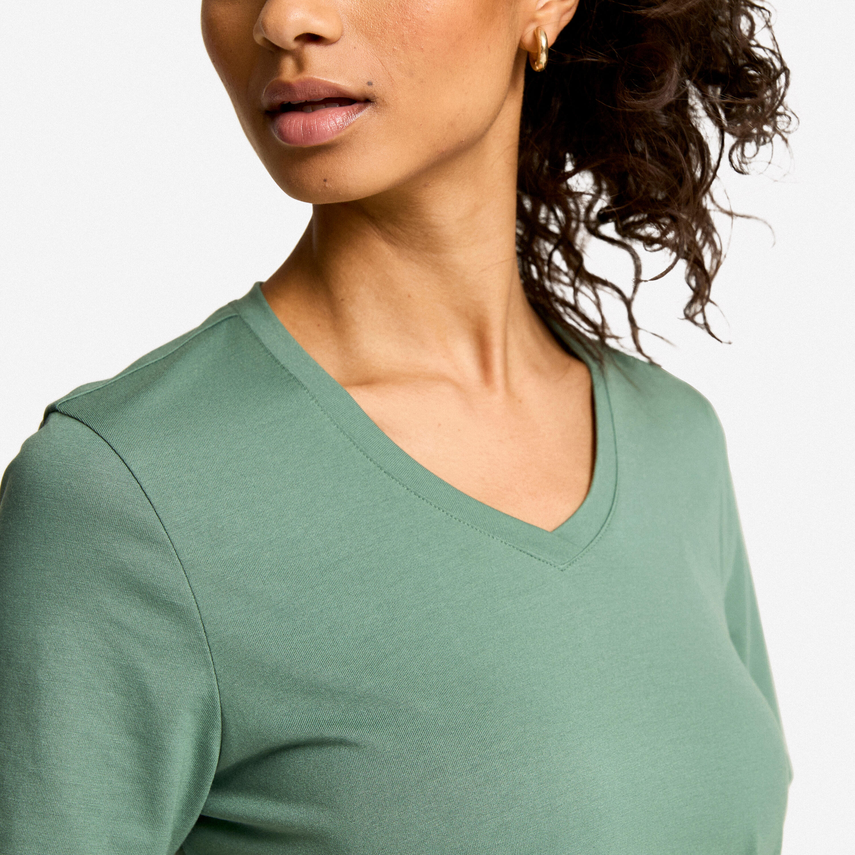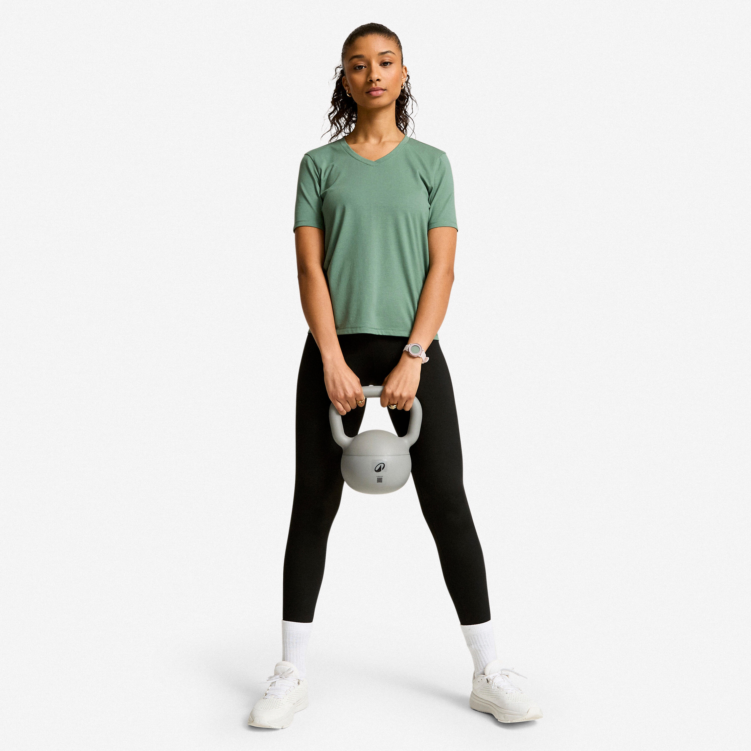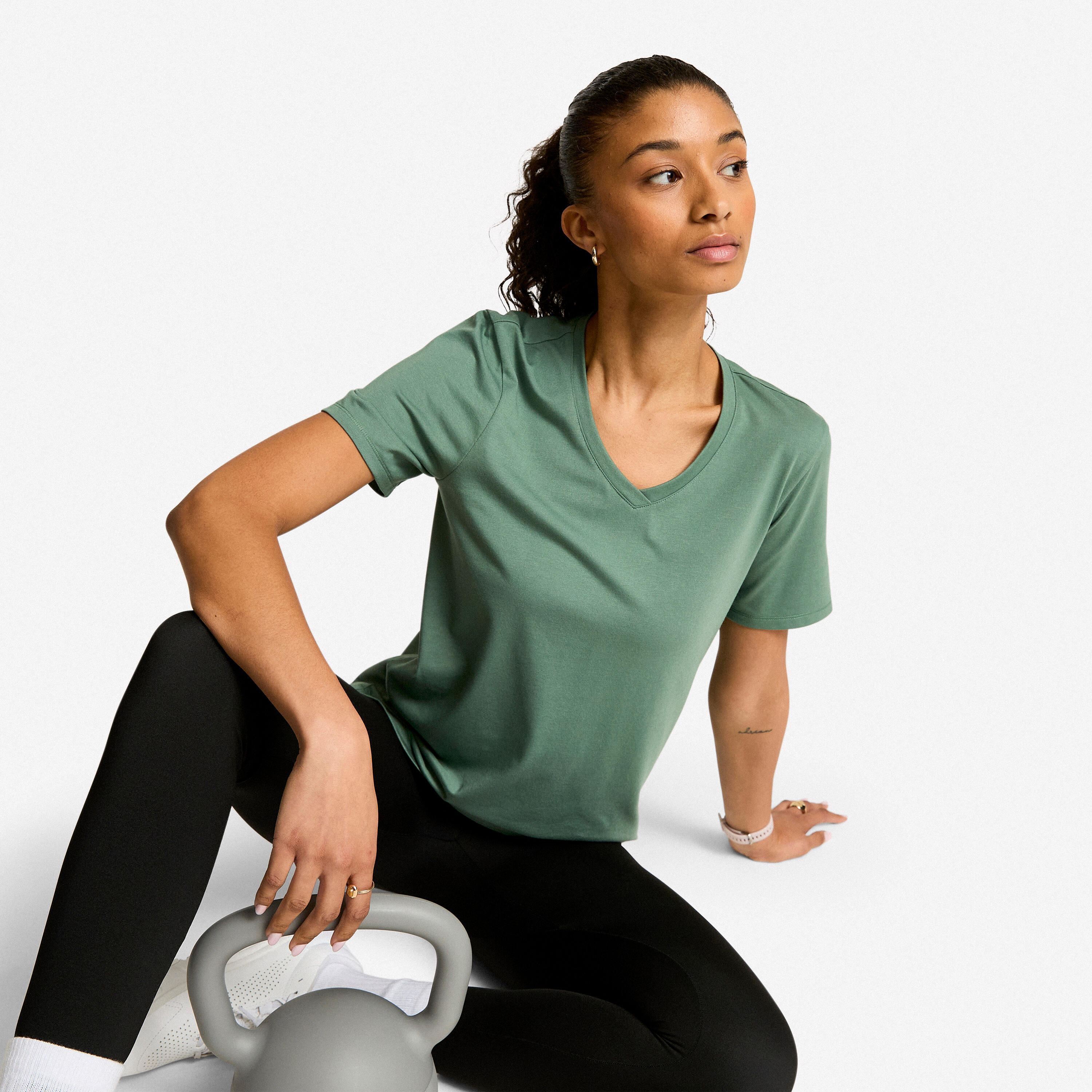 Le col V apporte une touche féminine à la coupe droite. Les 30% de modal assurent fluidité et douceur. La fibre COOLMAX® vous garde fraîche et au sec pendant votre séance.