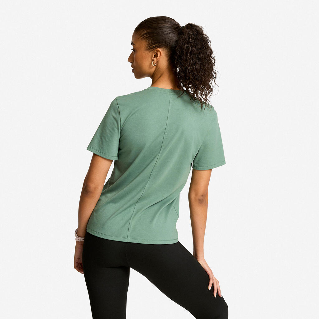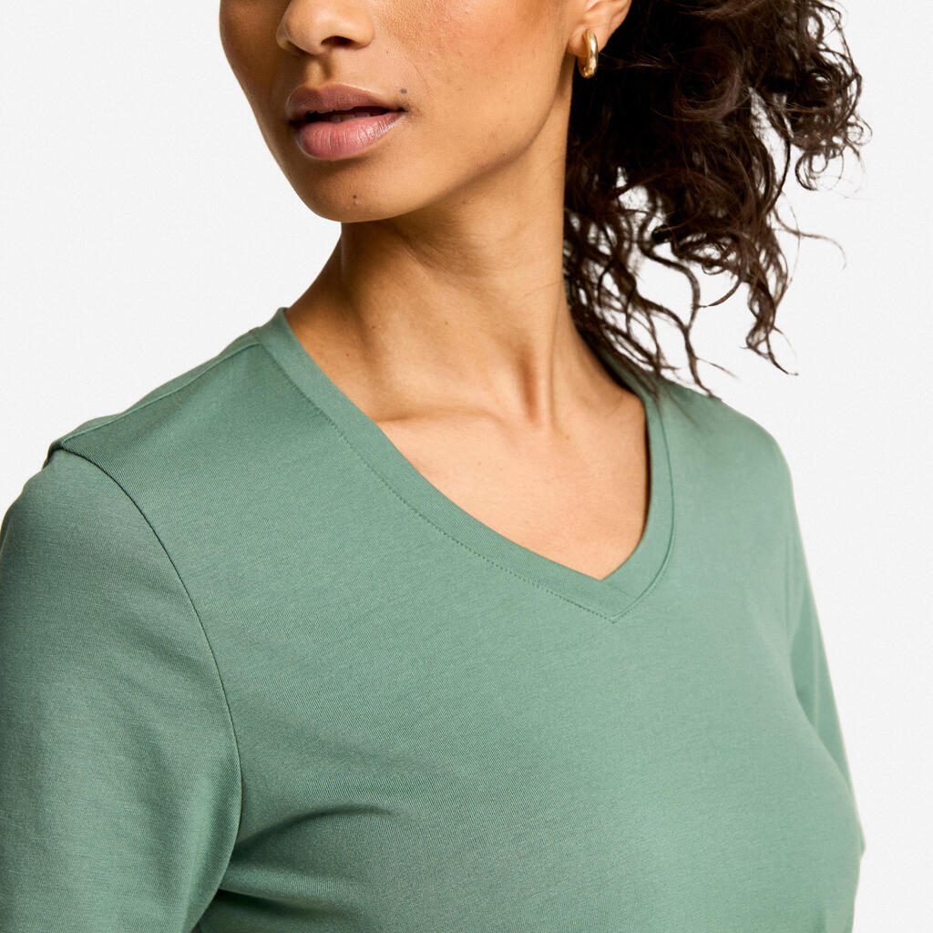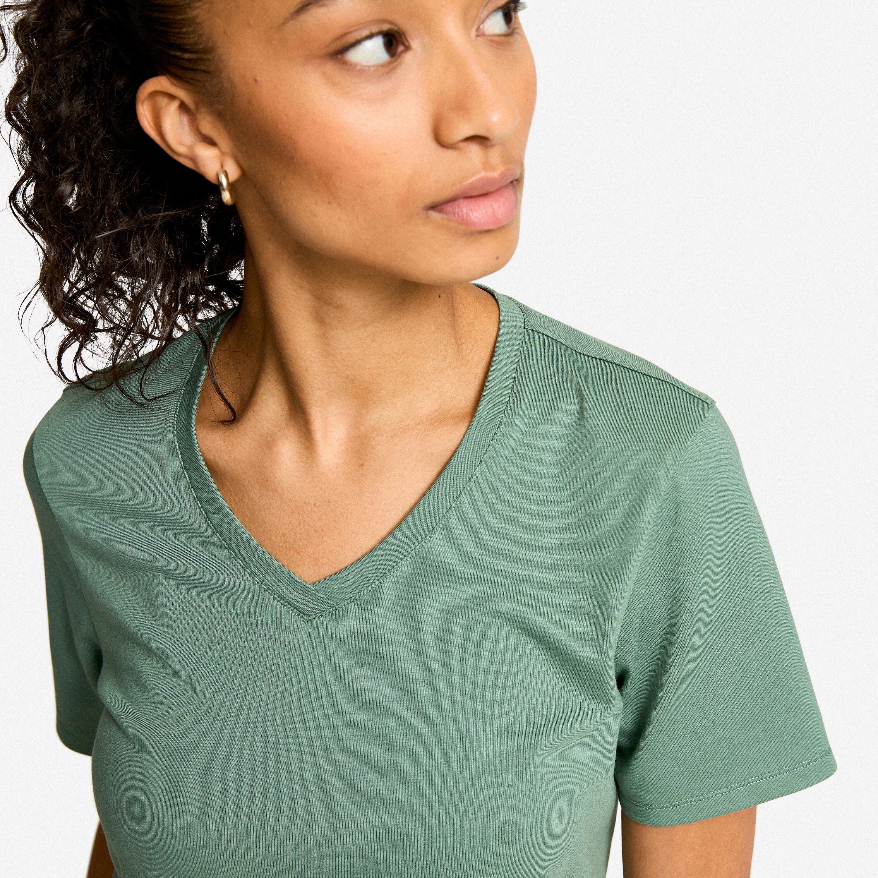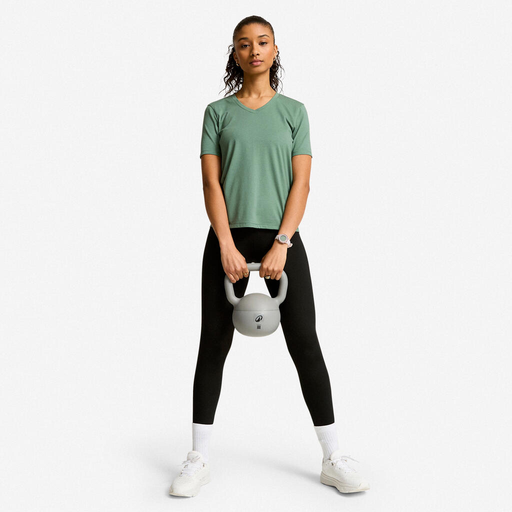 Le col V apporte une touche féminine à la coupe droite. Les 30% de modal assurent fluidité et douceur. La fibre COOLMAX® vous garde fraîche et au sec pendant votre séance.