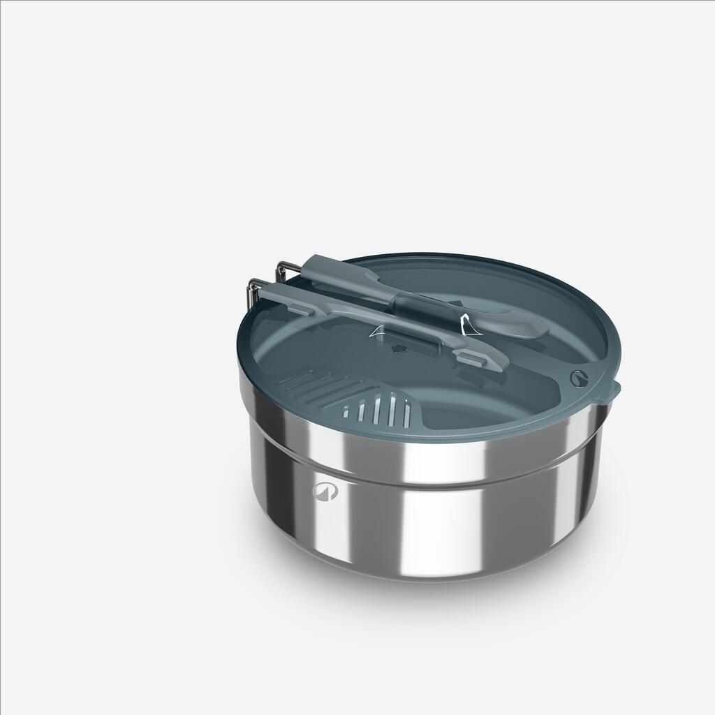 Les éléments se rangent à l'intérieur de la popote. D'abord les 2 assiettes creuses puis les couverts qui peuvent se clipser entre eux. Le couvercle se place ensuite et est bloqué par la poignée qui se replie.