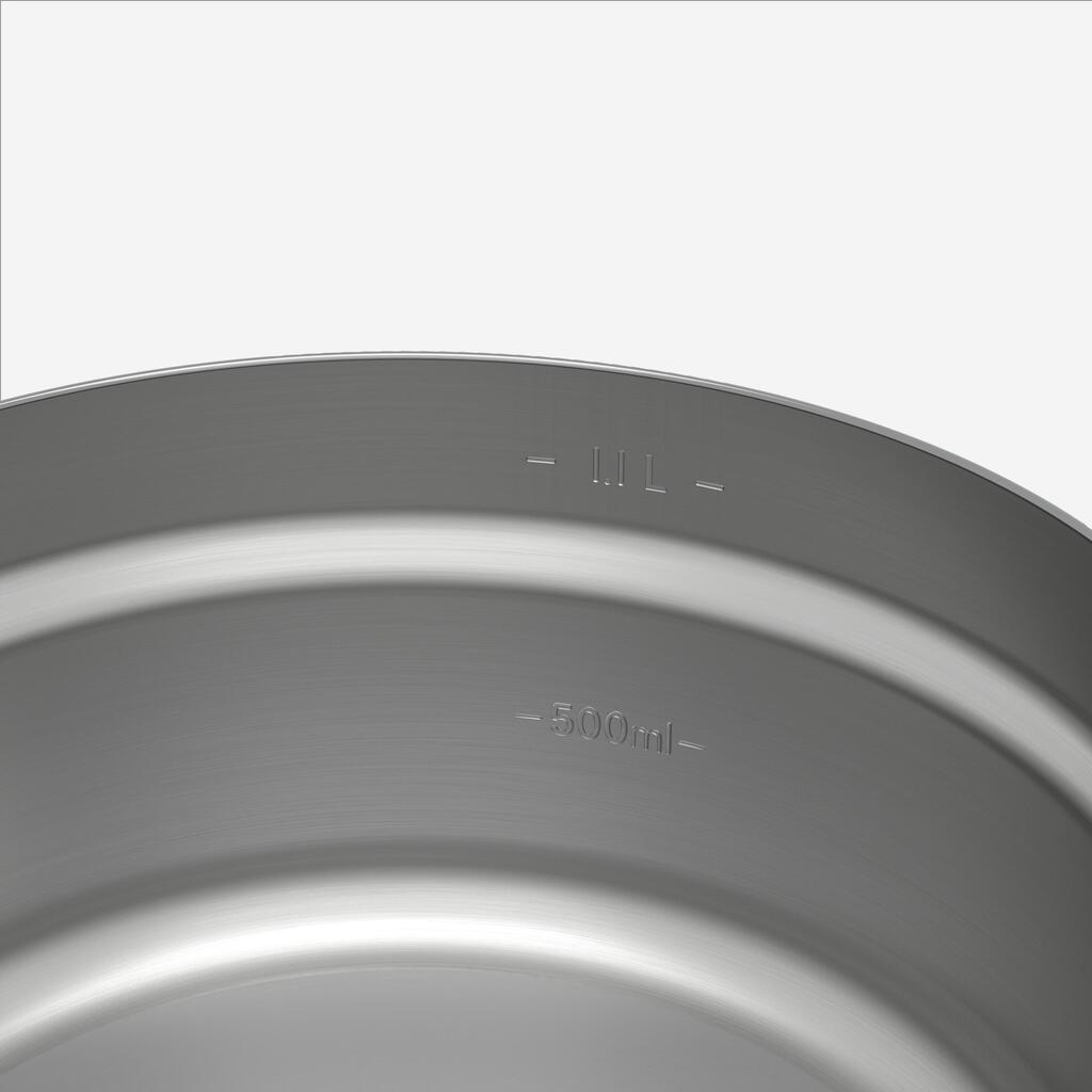 1 casserole graduée avec 1 poignée repliable brevetée. (1,1 L utile, 1,3 L total, 242 g, Ø 17 cm x 8,5 cm)