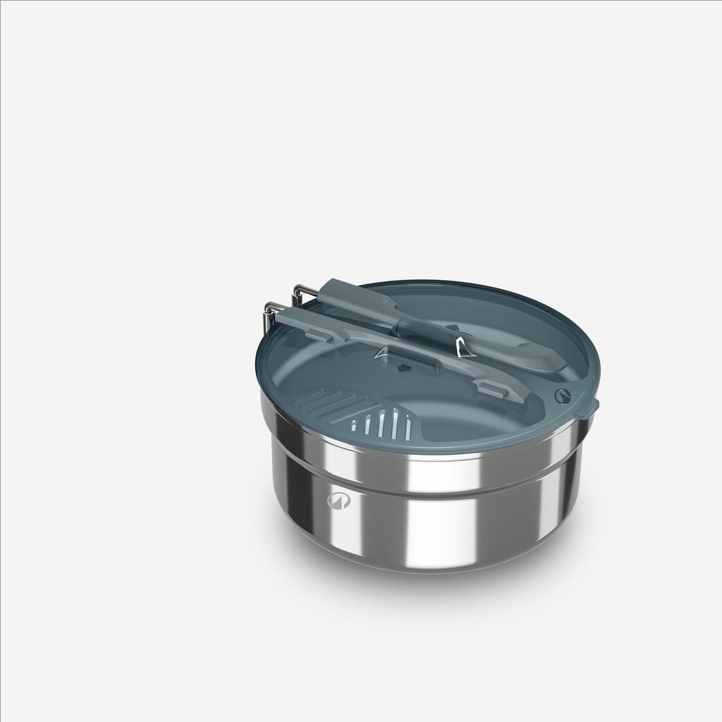 Les éléments se rangent à l'intérieur de la popote. D'abord le bol puis les couverts qui peuvent se clipser entre eux. Le couvercle se place ensuite et est bloqué par la poignée qui se replie.