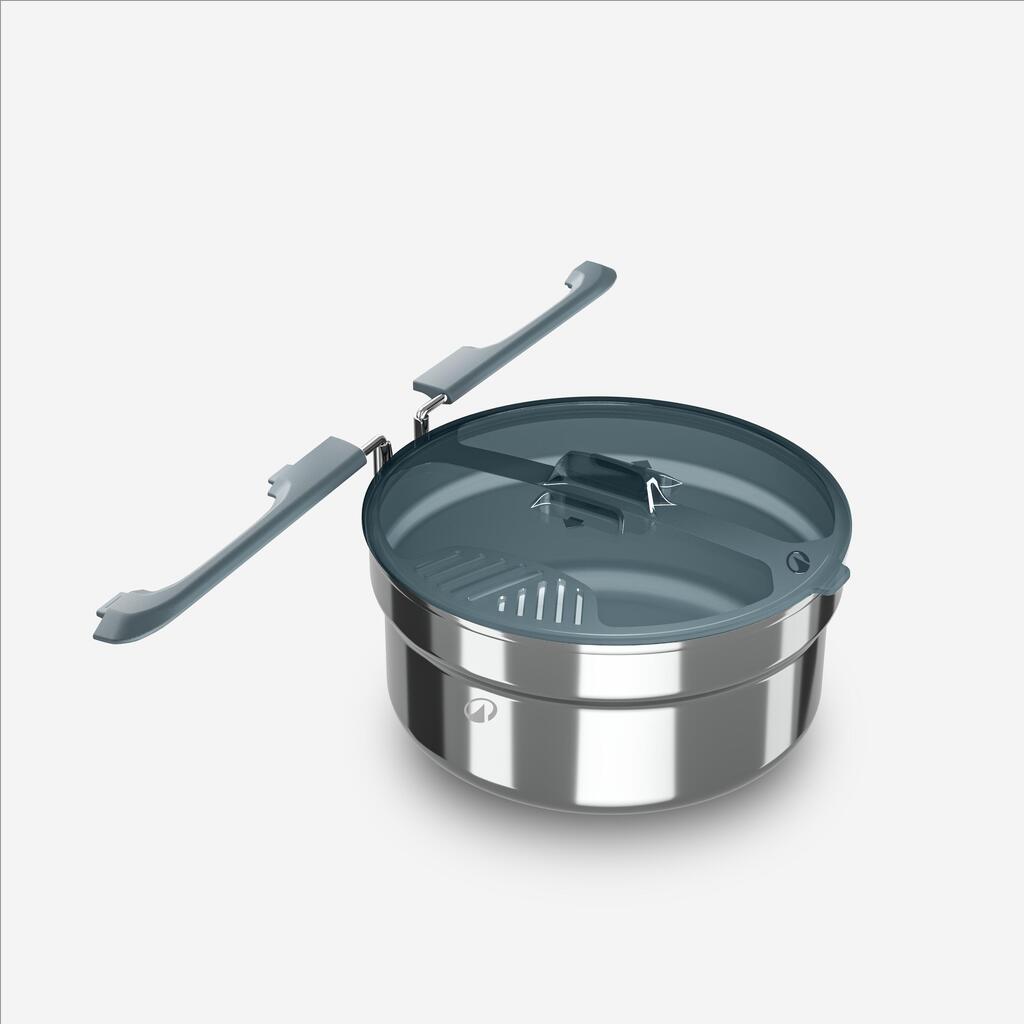 La casserole à une poignée repliable brevetée en 2 parties qui verrouille le couvercle pendant le transport.