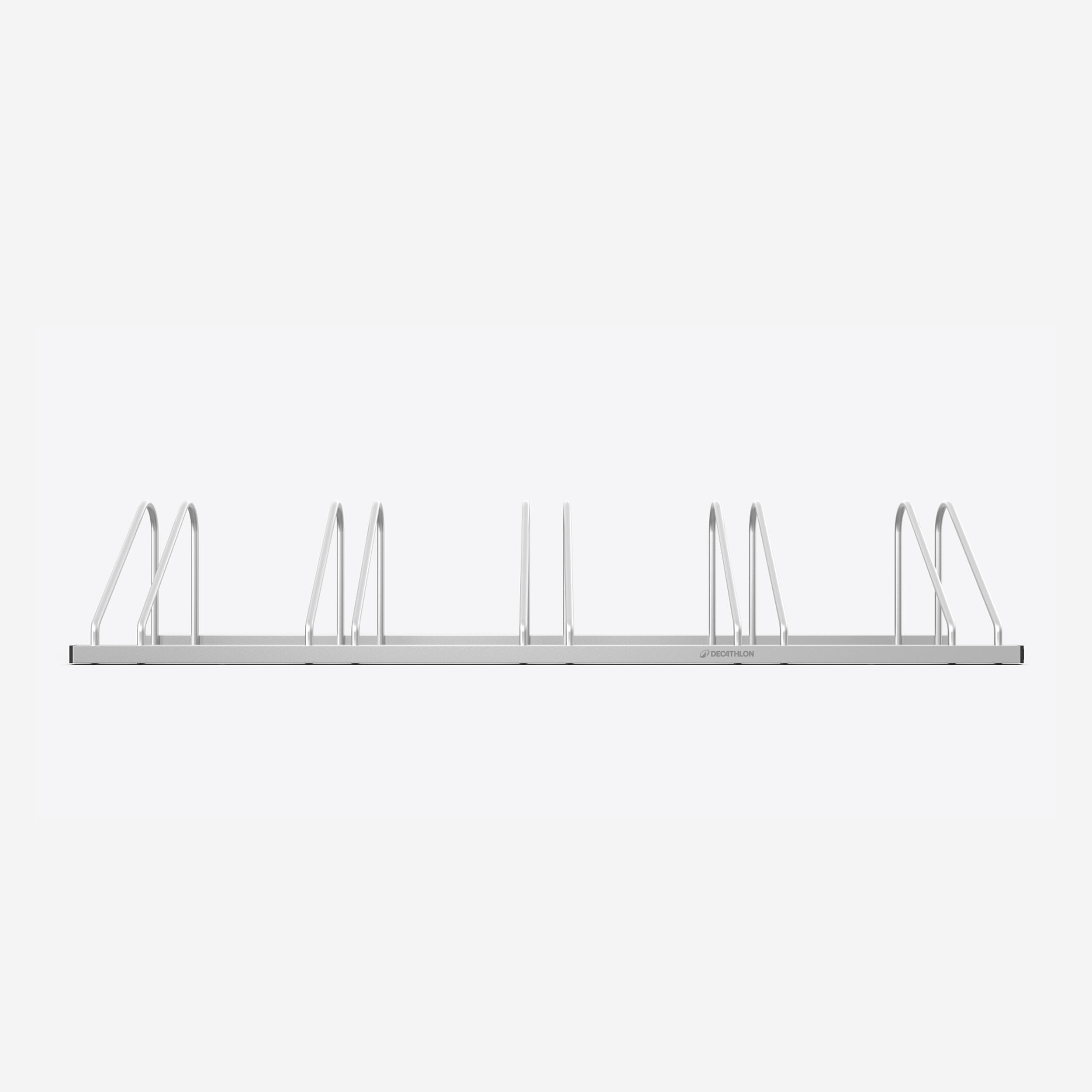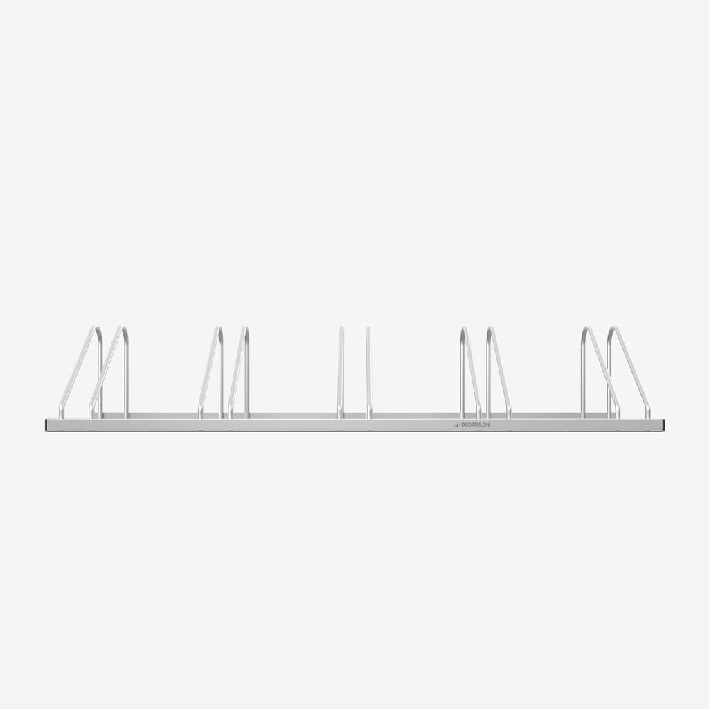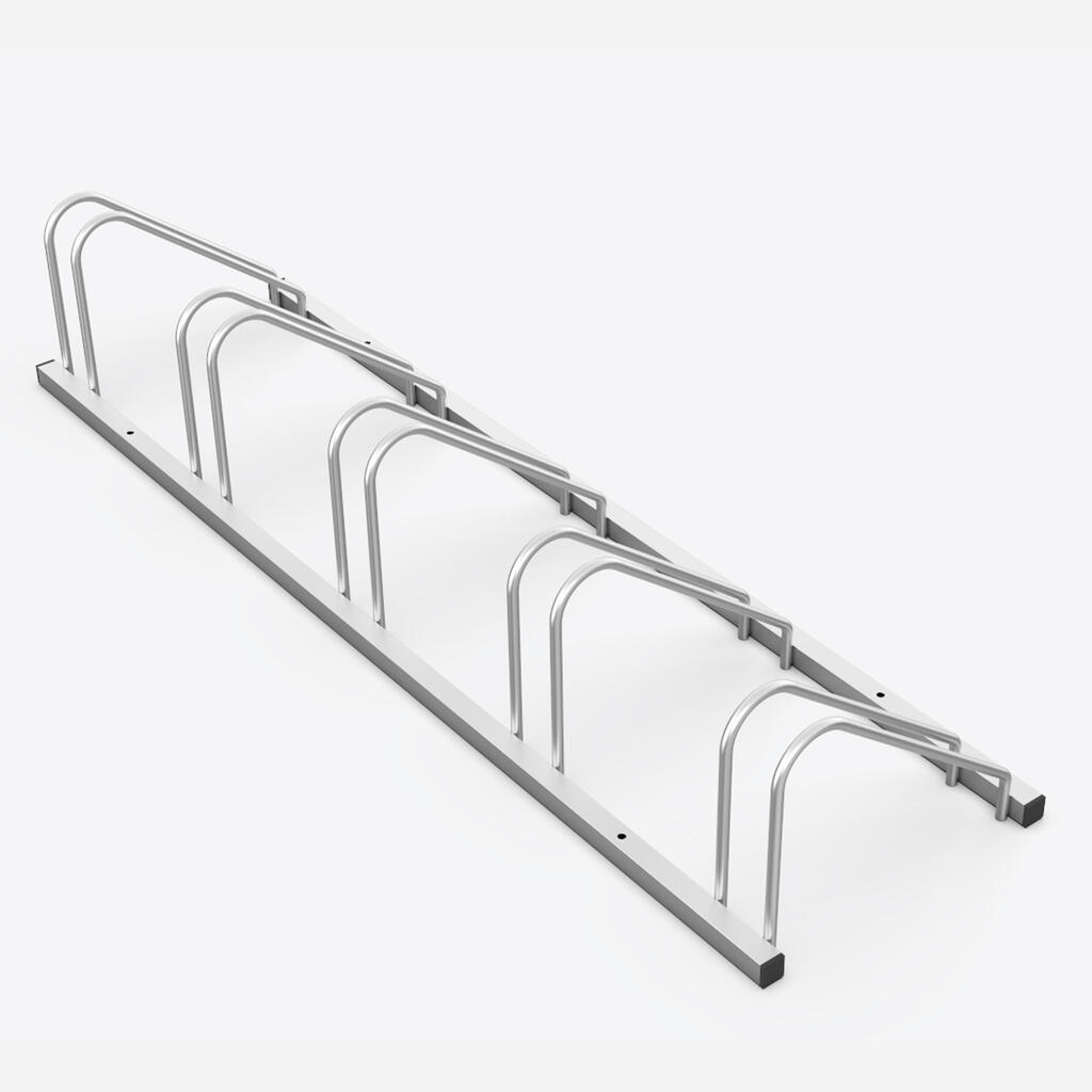 Ce grand râtelier pour 5 vélos se fixe au sol ou au mur (vis non fournies).