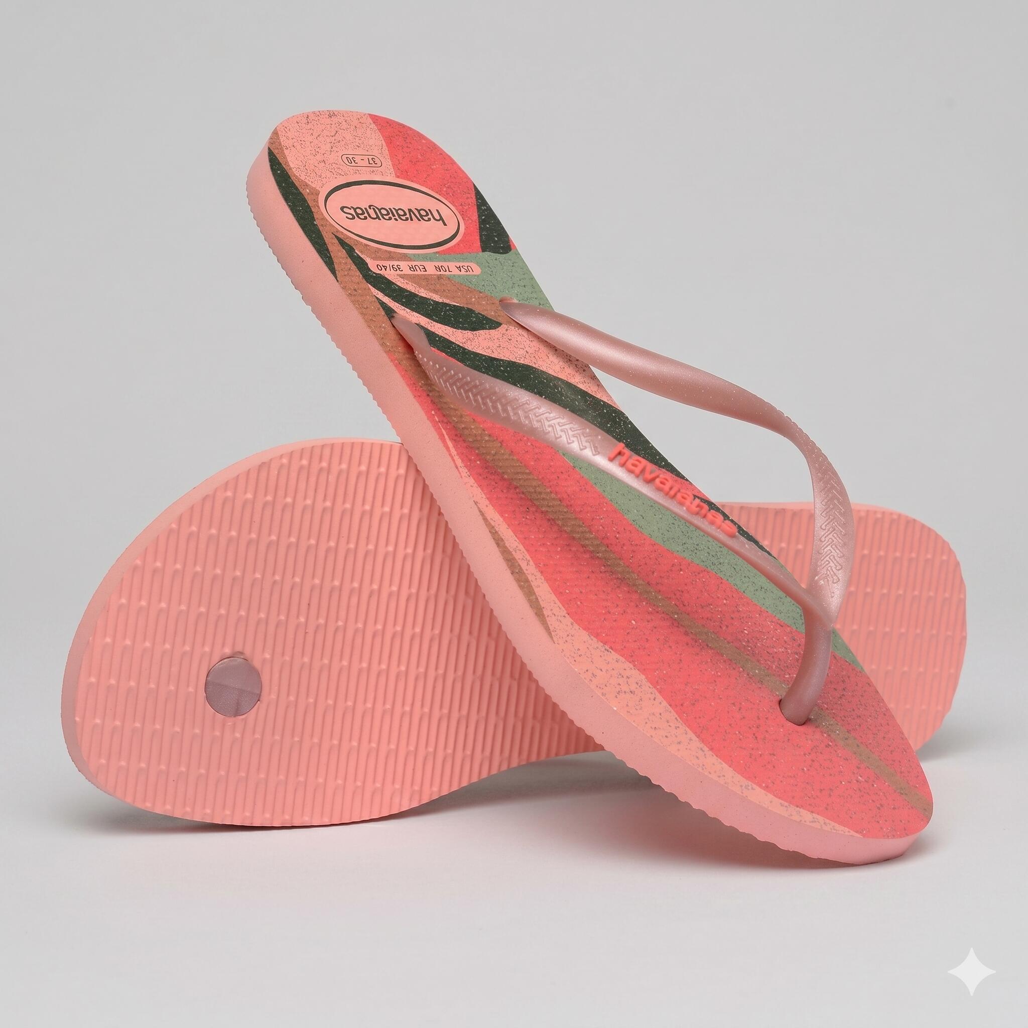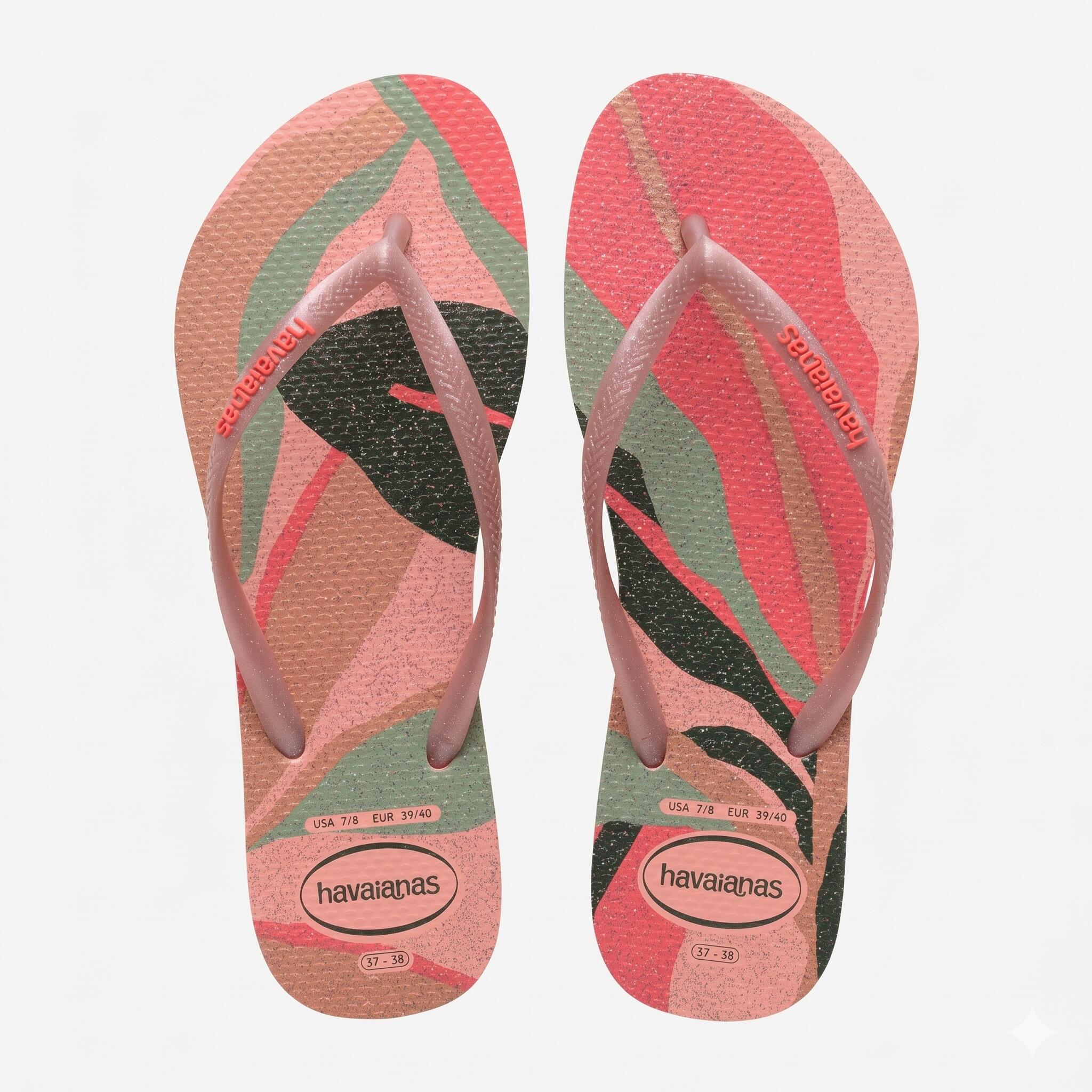 Havaianas Slim Palette Glow travaillent l’esprit tropical à travers une semelle pailletée et des brides métallisées, dans une lecture résolument graphique.